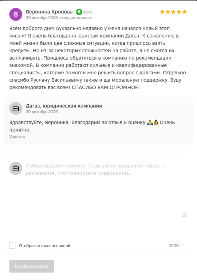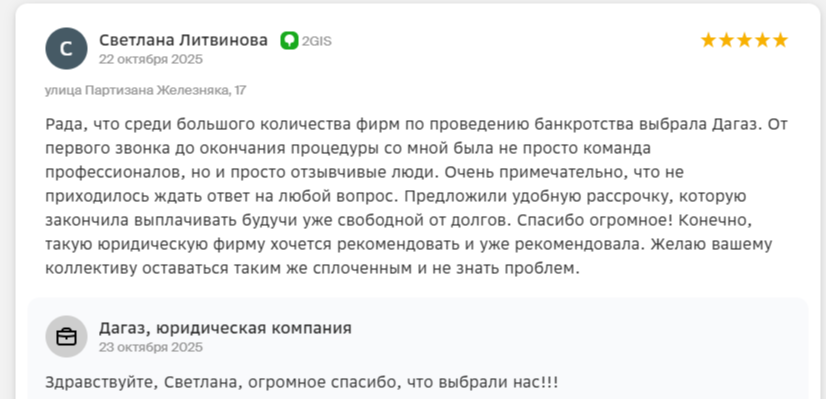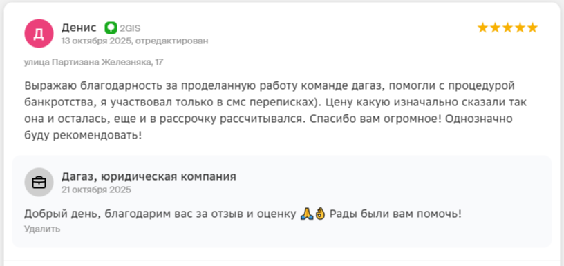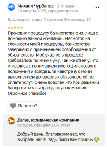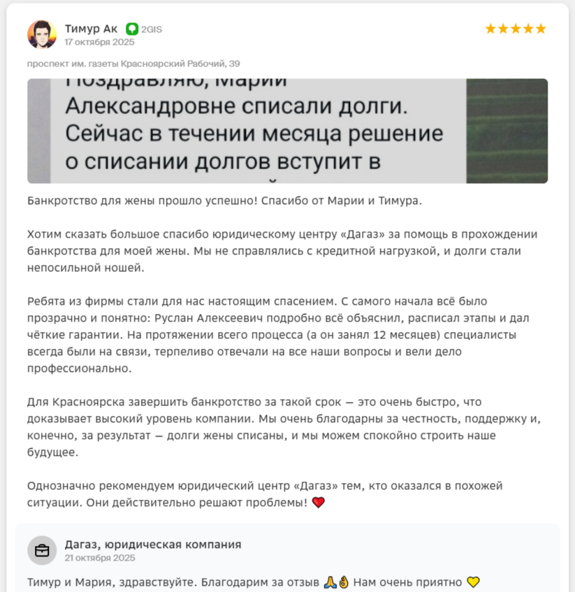 Меня зовут Руслан Васильевич — я юрист и основатель компании ООО «ДАГАЗ», на текущий день мы помогли списать долги 1000+ жителям Красноярска через процедуру банкротства и ни разу не проиграли в суде!